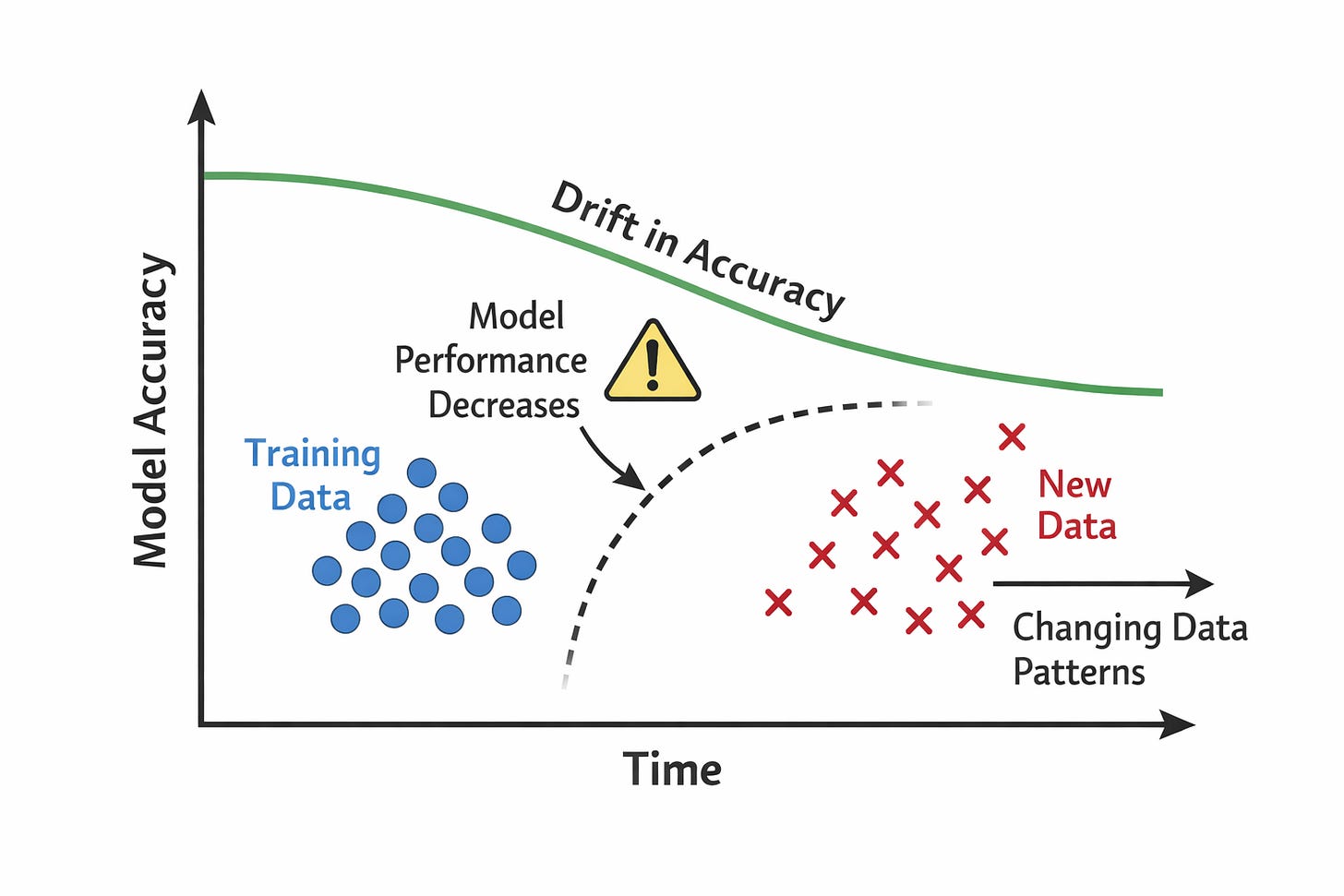 However, as the gap between the training data and current conditions grows, the model’s predictions may become less accurate. Performance slowly erodes without immediate notice.